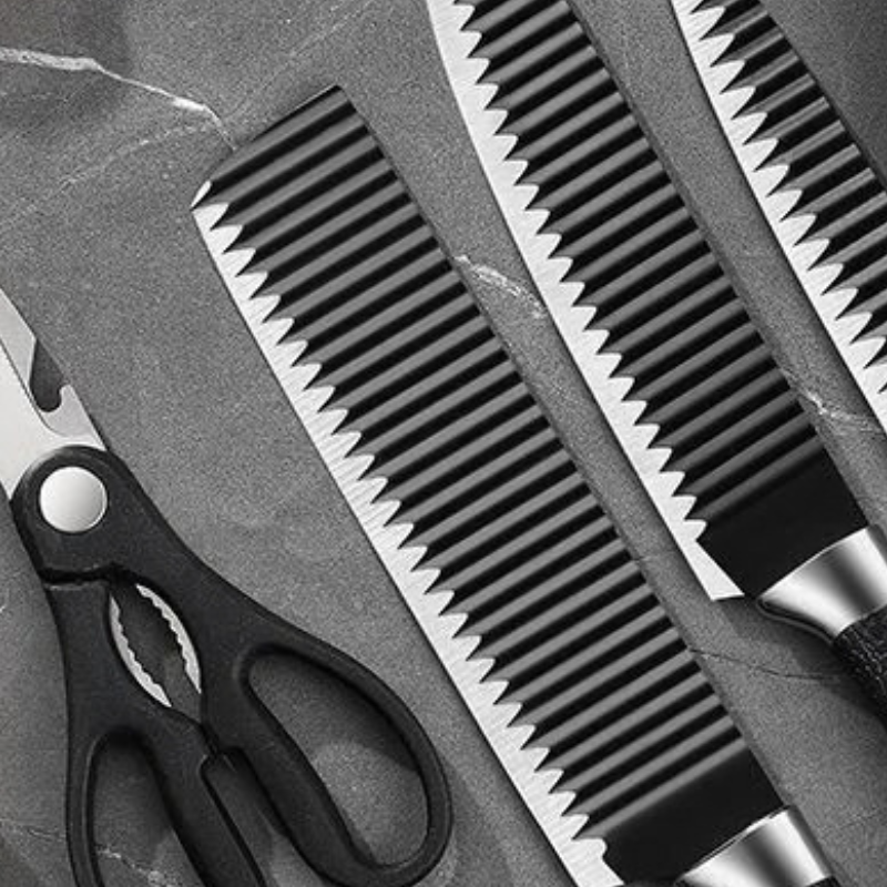 Design em laser que cria micro-bolsas de ar, impedindo que o alimento grude na lâmina durante o corte.